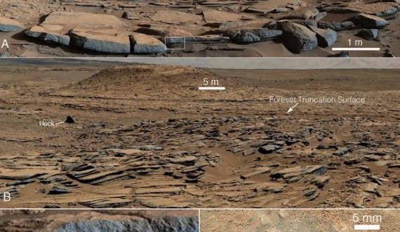 “Paradoxically, where there is a mountain today there was once a basin, and it was sometimes filled with water,” says Grotzinger. “Curiosity has measured about 75 meters of sedimentary fill, but based on mapping data from NASA’s Mars Reconnaissance Orbiter and images from Curiosity’s cameras, it appears that the water-transported sedimentary deposition could have extended at least 150-200 meters above the crater floor, and this equates to a duration of millions of years in which lakes could have been intermittently present within the Gale Crater basin” Grotzinger says. Furthermore, the total thickness of sedimentary deposits in Gale Crater that indicate interaction with water could extend higher still–up to perhaps 800 meters above the crater floor, and possibly representing tens of millions of years.