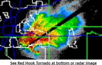 Abovet is the radar readout of the May 20, 2013, tornado. The actual tornado early on its track is located in the southern reddest hook near the bottom of the image.