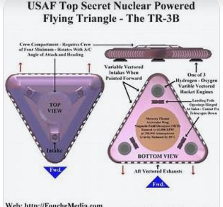 More significant is the large black triangular vehicle, the TR-3B that Fouche claims generates an intense magnetic field that reduces its weight by 89 percent. He says that the TR-3B uses the Biefeld-Brown effect (created by large electrostatic charges) to reduce its weight so that more conventional propulsion systems such as scramjets can give it amazing speeds. This would be well above Mach 18 that he claims is the speed of the SR-74. Mach 18 is approximately 13,701.73 miles per hour.