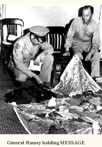 Finally, Ramey outlines how the situation was being treated publicly and how they were going to cover it up. First, he assures Vandenberg that the earlier highly inflammatory Roswell base press release (referred to as the “MISSTATE MEANING OF STORY”) was the work of an Army counter-intelligence team (“CIC/TEAM”), but that the “NEXT SENT OUT PR” (Press Release) would be “OF WEATHER BALLOONS.” Ramey finishes with the statement that the weather balloon story might be better accepted if they also added weather balloon radar target demonstrations. This apparently was the impetus for the national debunking campaign using the devices that followed over the next few days. Telegram held in General Ramey’s hand provides smoking gun proof of a “disk” crash and the recovery of “the victims of the wreck” Message Copyright ©2001 by David Rudiak