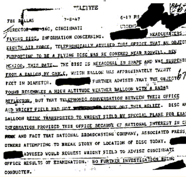FORT WORTH Another piece of data that proves the authenticity of the evidence is an FBI message sent on July 8, 1947, at 6:17 PM. The foremost feature of the teletype is that Major Kirton of the 8th Army Air Force Intelligence Office positively identifies as not being that of a RAWIN balloon and its radar target, though resembling them. We know from the photos and message that personnel at the 8th Army Air Force confirmed this was strange unidentified debris late on July 8, and that they had decided to fly the wreckage to Wright Field, Ohio where Air Force experts were gathered. Major Kirton was notifying the FBI of the latest developments