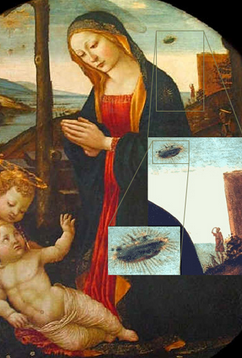 A fourteenth century fresco of the Madonna, Child, and St Giovannino, in Florence, attributed to the 15 Century school of Filippo Lippi. Depicted on the top right side the image of a UFO hovering in the distance. A blow up of this fresco reveals port holes. It seems to indicate a religious involvement between UFO’s and the  of the Christ Child.