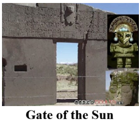 The famous Gate of the Sun leading into the city of Titicaca 4000 years ago has an ancient god from space carved on it. A blow up of the powerful creator god Viracocha is on the right of the photo. Further evidence in South America suggests strongly that a Sumerian colony established itself around Titicaca, in what is now known as Bolivia. According to legend the first Inca, The Incas appeared in Lake Titicaca tradition with red or brown hair . The gate is at the site of Tiahuanaco by the Tiwanaku culture, at 12,549.2 feet above sea level near La Paz, Bolivia. The Gate of the Sun is 9.8 ft (3.0 m) tall and 13 ft (4.0 m) wide and was carved from a single piece of stone. The frieze of the Gateway’s front-side shows 48 subsidiary figures called “attendants.” There are 32 attendants with human heads and 16 (originally 10) anthropomorphic figures with huge avian heads possibly representing extraterrestrials.