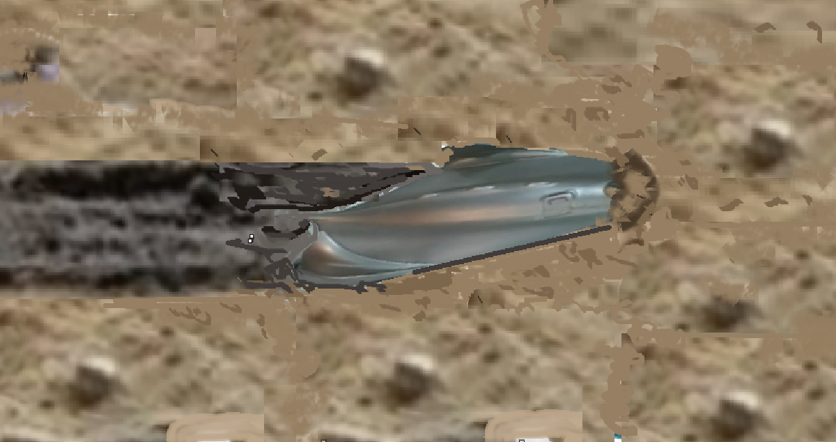 Standing in the middle of the gravel soil at the crash site and peering down at the ground OR from the north end of the swath looking to the south, you could just barely discern a slight blue hue similar to a swimming pool blue running the full length of the foliage-free strip. If you went to the other end, the south end, and looked back you couldn’t see it. If you ran your foot ever so slightly over the ground in an arc or line breaking the topsoil the color would disappear leaving only the regular color of the dirt showing. It was as though an ultra-thin turquoise blue patina had been sprayed on all along the rocks and gravel on the north side and the top of their surface, but none of the color had reached the backsides of their surface facing south.