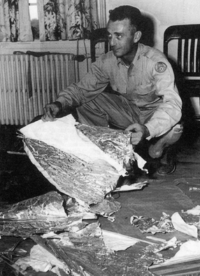 He was incredibly surprised they would put this smelly mess on the General’s rug. After spreading out the debris on the rug, General Ramey arrives holding a message in his hand. Johnson takes six photos with the debris. The negatives of four photographs are at the University of Texas Archives and copies are being examined by the Roswell Photo Interpretation Team (RPIT) that was formed to evaluate the photographs. Later, Warrant Officer Newton the base weather officer is brought in to identify the debris. He identifies the material as being from a weather balloon and its Rawin radar target reflector device that looks similar to a box kite. The target reflector is made of paper backed foil and balsa wood sticks. “Roswell Report